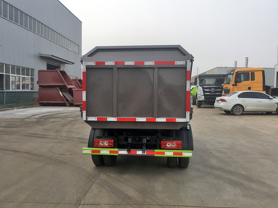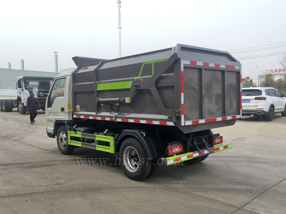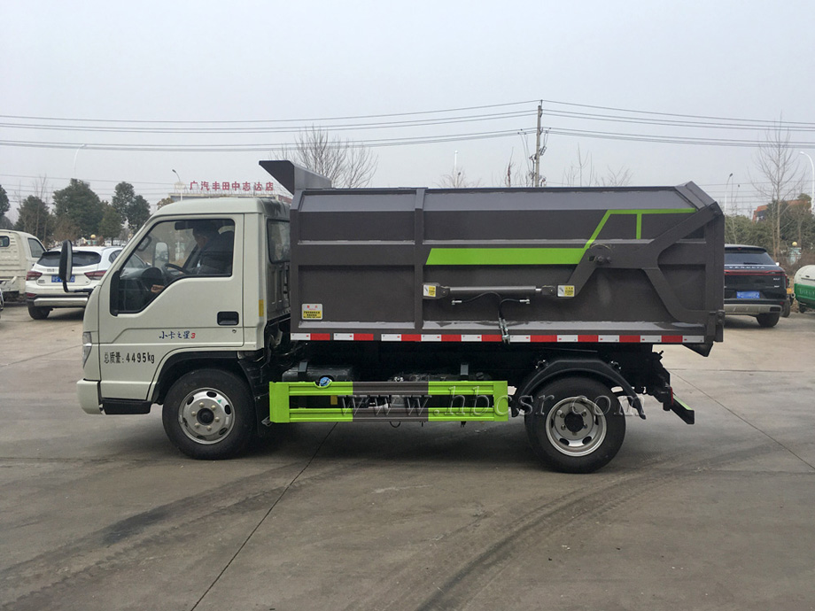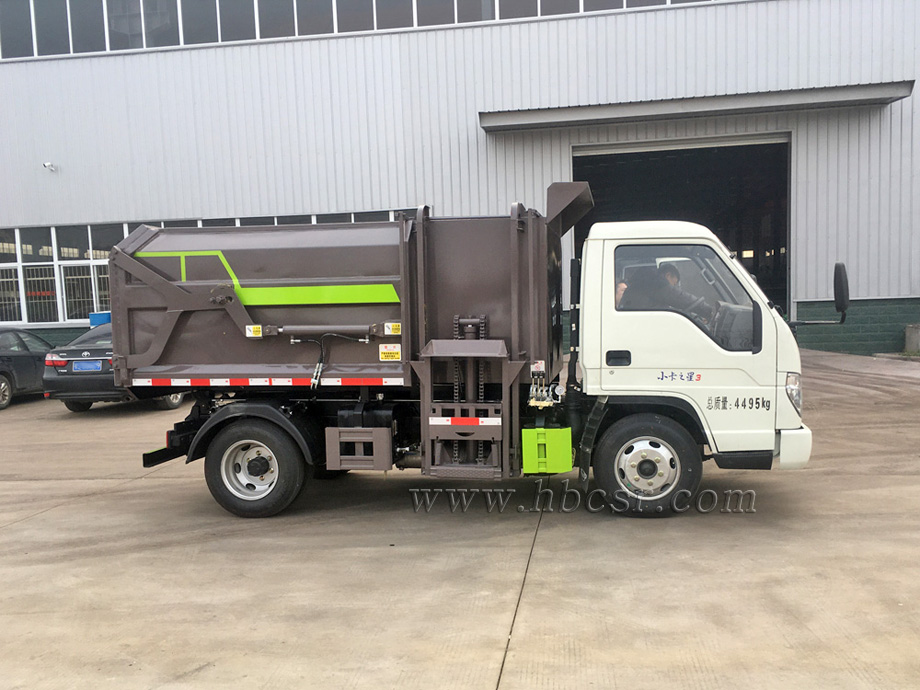 該車箱體容積約4立方,箱體前部側(cè)面帶有掛桶提升機構(gòu),可自動舉升垃圾桶倒入垃圾,帶自卸功能,尾部裝有橡膠密封條,防污水滴漏,杜絕二次污染。掛桶垃圾車可根據(jù)客戶要求搭配120升或240升塑料桶和鐵桶。
