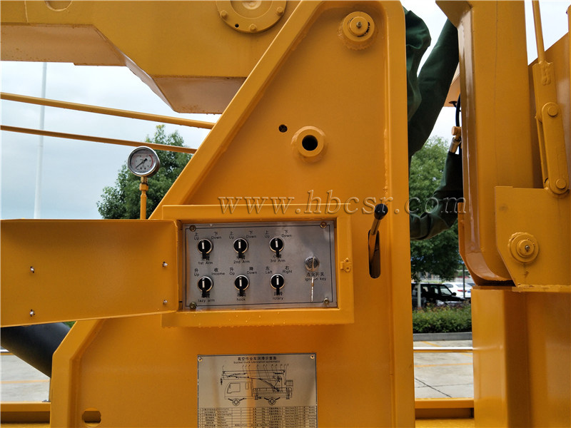 在作業(yè)斗內(nèi)和回轉(zhuǎn)座上均設(shè)有操縱裝置, 遠(yuǎn)距離**發(fā)動機(jī)的啟動/停止、高速/低速,采用電液比例閥**臂的動作,平穩(wěn)性好,工作臂可左、右360°連續(xù)旋轉(zhuǎn),靠連桿機(jī)構(gòu)自動維持作業(yè)槽水平,主泵出現(xiàn)故障時可操縱應(yīng)急泵下降作業(yè)槽,具備夜間照明,可起吊重物。