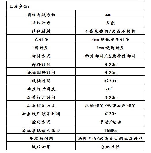 罐體采用優(yōu)質(zhì)碳鋼板材,罐體內(nèi)部帶固液分離功能(全推推板,不銹鋼泔水分離網(wǎng)板),罐內(nèi)加熱功能(用于嚴寒地帶防止罐內(nèi)餐飲垃圾凍結(jié)凝固,采用柴油燃燒機加熱,加熱速度快效果好,可設置高低溫實現(xiàn)自動溫控)全液壓操作系統(tǒng),工作人員操作方便,罐體舉升自卸,拉桿式掛桶提升機,可以掛120/240升垃圾桶進行作業(yè),后蓋液壓驅(qū)動開啟、鎖緊,方便人員操作。