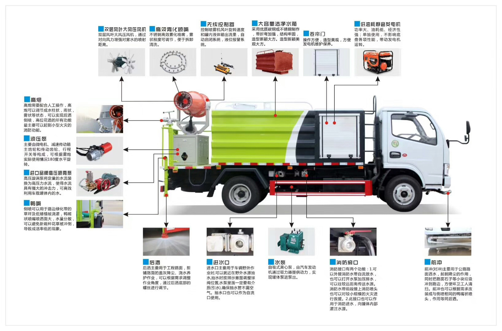 狀,柱狀射程28米,霧狀射程14米,),整車灑水寬度大于14米。配備優(yōu)質(zhì)大功率專用灑水泵,取力器,雜物過濾網(wǎng),國標(biāo)通用65型消防接口(可通過消防栓加水