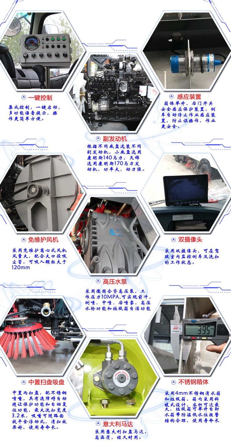 | 標(biāo)準(zhǔn)配置: | 采用“中置二掃盤+中置吸嘴+后噴霧裝置”的結(jié)構(gòu)布局,康機(jī)170馬力的副發(fā)動(dòng)機(jī),三洋馬達(dá),德國(guó)原裝進(jìn)口高壓水泵(帶前沖/側(cè)噴/中噴/后噴霧/側(cè)沖洗車水**/垃圾箱自潔裝置),高壓路沿清洗噴頭,威龍低壓水泵,不銹鋼的水箱垃圾箱(均帶防溢或低水位報(bào)**裝置),施耐德的**開關(guān)、美國(guó)傳感器,尾部的LED箭頭燈,倒車及洗掃狀態(tài)室內(nèi)監(jiān)視器。18米高壓沖洗卷盤,集成式運(yùn)動(dòng)**器,一鍵電腦**。 |