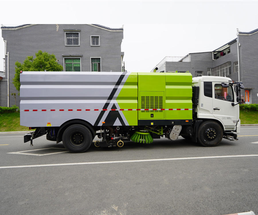 清掃:副發(fā)動(dòng)機(jī)驅(qū)動(dòng)液壓油泵和風(fēng)機(jī)工作。液壓油泵驅(qū)動(dòng)左、右掃盤伸縮、升降、旋轉(zhuǎn)。左右掃盤將兩側(cè)的垃圾掃至洗掃車下面、吸嘴前方。風(fēng)機(jī)工作使垃圾箱、吸管和吸嘴組成的風(fēng)道產(chǎn)生高速氣流,在氣流的作用下,垃圾吸入吸嘴,并進(jìn)入垃圾箱中。底盤發(fā)動(dòng)機(jī)驅(qū)動(dòng)洗掃車向前行走,掃**吸嘴前方的垃圾不斷進(jìn)入到吸嘴中,并源源不斷地被吸到垃圾箱中,實(shí)現(xiàn)路面清掃。